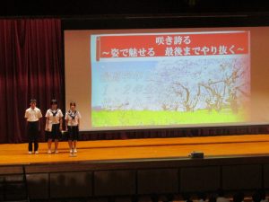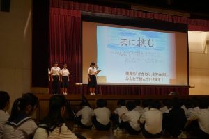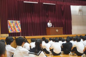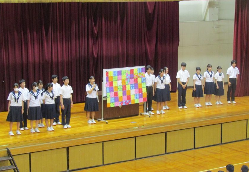 久しぶりに全校生徒が体育館に集まり顔を合わせました。それぞれの学年、生徒会執行部の発表から中部中学校への強い想いが伝わってきた見事な会でした。「『つなぐ』とは並べるだけなく、意味や想いを込めて結びつけること」とは笠嶋校長先生の言葉。後期の中部中学校のさらなる『しんか』を期待しています。