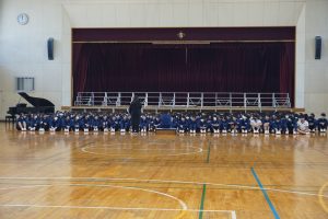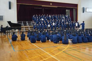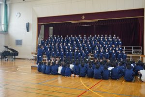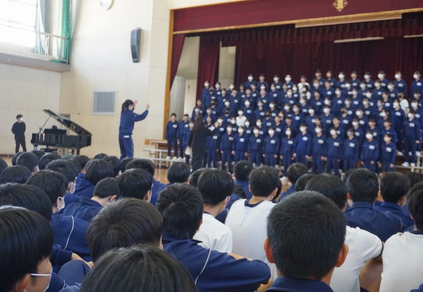 各クラスの合唱が仕上げに入ってきました。学年合唱も限られた中で最後のポイントを確認しています。この日は男女で互いに見合いながら、パートの重なりを感じていました。この1週間で学級合唱での気持ちの高まりを感じます。そのため、学年合唱ではさらに周りの刺激を受けて、中間発表よりも体育館で歌声が響いています。全体をまとめる指揮者、伴奏者の頑張りも皆の合唱を支えています。本番まで残り2日です。合唱以外でも「そろえる」場面を大切にします。