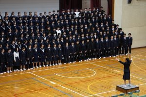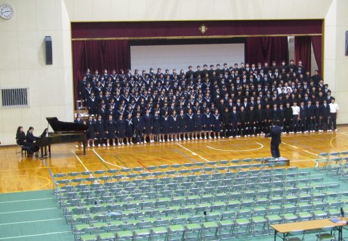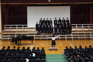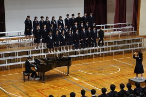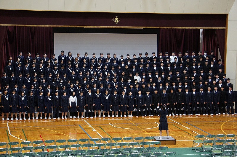 東日本大震災後をきっかけにつくららた学年合唱曲「ほらね、」自然の大きさ、人と人とのつながりの大切さが歌詞には込められています。それを2年生全員で体育館全体に響かせていました。見ていた1年生に憧れをもってもらえる合唱でした。