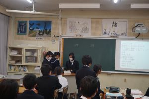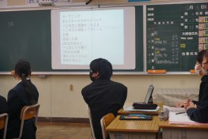 11月に2・3年生合同クラス委員会を行いました。そして今回は、1・2年生の合同クラス委員会です。ここでは2月に行われる伝統を引き継ぐ会の具体的なプログラムについて検討されていました。「1・2年生がこれまで頑張ってきたことを伝えたい」「3年生に感謝を伝えたい」という意見がたくさん出ました。学級のリーダー達が集まっているだけあり、来年度からの中部中まで見据えているようでした。「今のあなたたちは真のリーダーと言えますか?」という3年生の話が2年生に伝わっています。