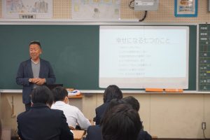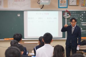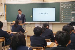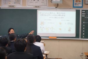 11月に職業体験を終えた2年生。NPO法人「つきせぬ」から各クラスに講師を派遣していただき、生徒達に人生経験を伝え、進路選択に向けて大切にするとよいこと等を伝えていただきました。ある学級では幸せになる7つの条件を、生徒達はうなずきながら聞いていました。以下の職種の方々にお世話になりました。ありがとうございます。