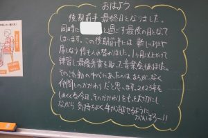 朝の教室の黒板に、担任からのメッセージがありました。キーワードは「仲間とのかかわり」。どの学級でも大切にしてきたことです。