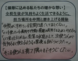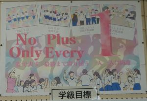 1組の誇れる姿は「確かな想いを大切に取り組む」姿です。掃除では「ここを使う人が気持ちよく使えるように」などの想いから13分間集中して掃除をする姿があります。また、授業では、わからない所があると自分から聞いたり、困っている仲間にわかるまで寄り添ったりする姿が自然とできています。そのような姿を帰りの会のクラス委員の話で、どんな想いで取り組んでいるのか、その人の想いと一緒に良さを広げることで、確かな想いをもって取り組む姿を増やすことができました。卒業に向け「姿で魅せる3年生」として日常を最後までやり抜いていきます。