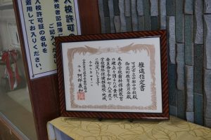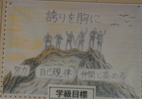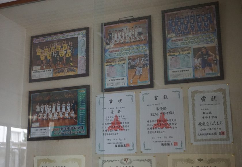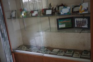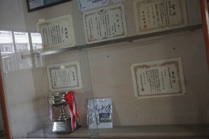 職員玄関にトロフィーなどを飾るガラスの棚があります。ここには過去の先輩方の栄光がたくさん残されていました。調べてみると平成時代の昔の物から展示されていることが分かりました。そこで、令和元年以降のものに絞って展示することで最新の表彰が分かるように模様替えを行いました。ガラス台には、美術に出品した作品も並べてあります。玄関を通る機会がありましたらぜひご覧ください。