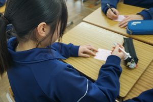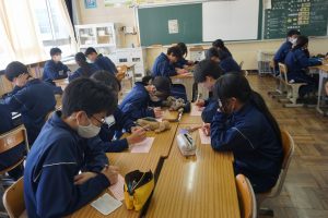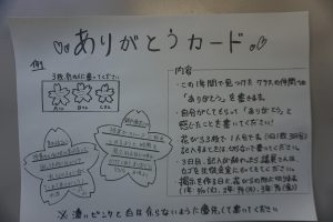 1年間「しんか」をテーマとして取り組んできた生徒会。3日間の取組は、『ありがとうカード』を記入して仲間に感謝を伝えることです。1日一人のよさを花びらに記入します。3日間で3人書いていきます。全校のたくさんのよさが集まり、大きな桜の木の掲示になる予定です。伝統を引き継ぐ会では、この取組も含め1年間の集大成が発表されます。