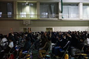 <当日:その4 6年生の姿>写真にあるように背筋を伸ばして姿勢よく発表を聞いています。児童代表のあいさつも素敵でした。来年度が楽しみです。