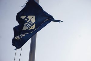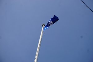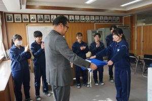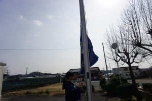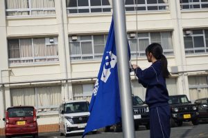 中部中では、生徒会執行部員が毎日校旗を掲揚台に掲げています。おそらく昔から続いている伝統でしょう。そのため、校旗も傷むのが早くボロボロになってきていたところでした。先日新しい校旗が届き、校長先生から生徒会へ渡されました。生徒会長が受け取るとすぐに新しい校旗に変えに出かけます。この動きに中部中生徒会執行部としての誇りを感じました。入れ替わった瞬間の写真です。