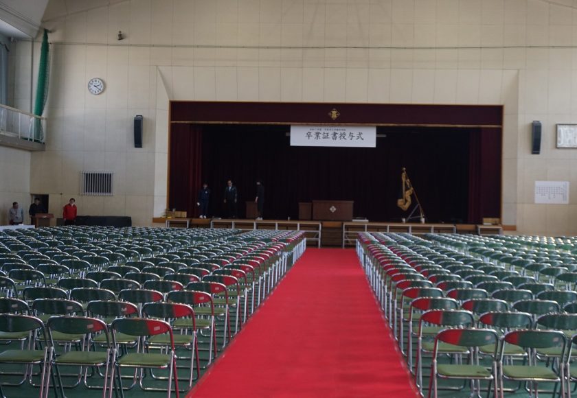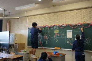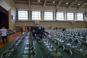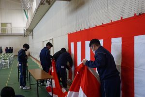 いよいよ1年で一番大切な行事である、卒業証書授与式の日が迫ってきました。3年生が気持ちよく卒業できるように、2年生の学級執行部を中心に、細かい部分を掃除して会場設営しました。赤じゅうたんの埃を丁寧に取ったり、白布のしわを取りながら丁寧に敷いたりする姿から3年生への感謝の気持ちも伝わってきました。支援学級では、3年生とのお別れ会の教室作りも分担して進んでいました。めざしている『考え 力を合わせて やり抜く生徒』の姿です。