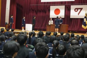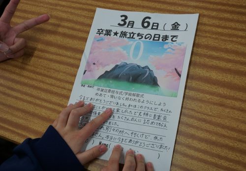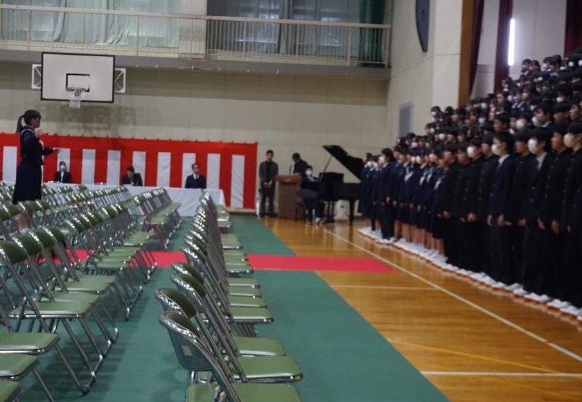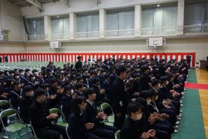 明日の卒業式に向けて最終確認をしました。凛とした姿で入場した3年生です。笠嶋校長先生からは、卒業式になると必ず思い出す生徒について話がありました。明日は「ハイ」という返事1つに3年間のすべてを込めて成長を示すことを期待しています。また、9年間休まず通った生徒2名、3年間休まず学校に通った生徒13名も称えられました。