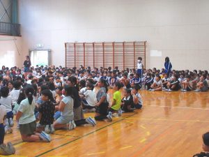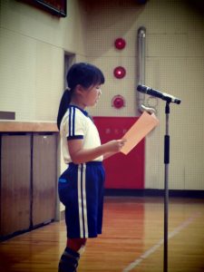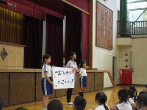 全校のみんな、先生たちが児童のみなさんの話に静かに聞き入りました。全校の前で堂々と大きな声で話す姿がとても頼もしかったです。