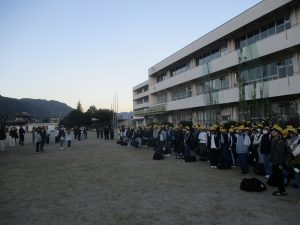 6年生はまだ薄暗い時間から集合し、保護者の方々や兄弟、先生たちに見送られて出発しました。