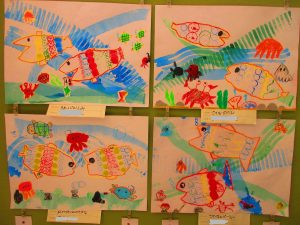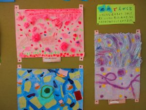 土田小の廊下に「アートギャラリー」があります。各学年の作品が展示されています。