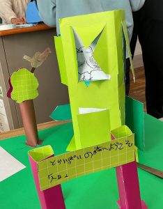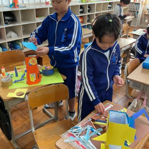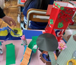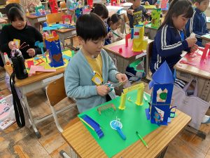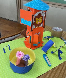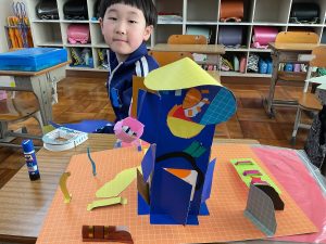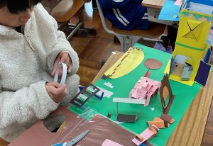 図工でカッターを使って、紙を切り、立体的な作品を作っていました。