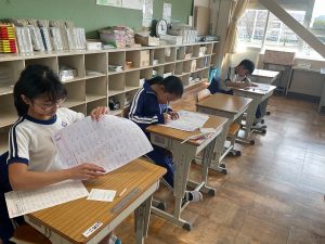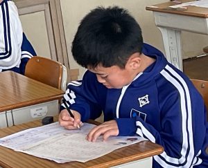 また、国際教室の中学年の教室では、静かに集中して漢字練習に取り組んでいました。 お手本を確認して画の形やとめ・はねに気をつけながら、一画一画ていねいに書こうとする姿がとても印象的でした。