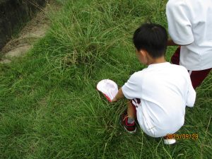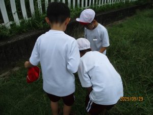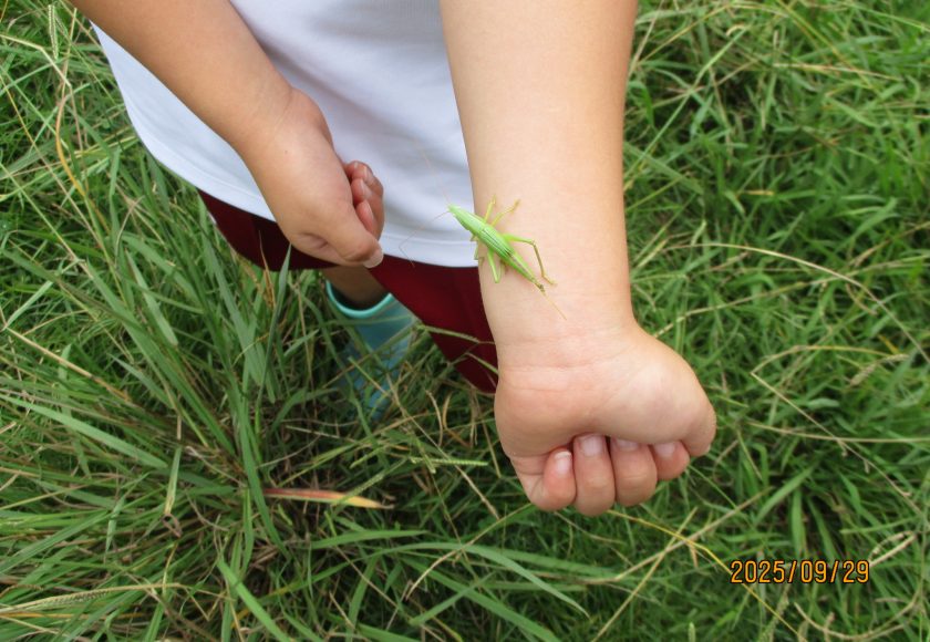 めっきり朝晩涼しくなりました。やっと虫たちが活動し始めたのでしょう。グランドのフェンス近くの草むらにはバッタがたくさん飛び跳ねています。ショウリョウバッタ、コオロギなどが大小たくさんいます。先週あたりから休み時間になると、1年生の子どもたちが虫みつけをしています。飛び跳ねているバッタを捕まえるのはかなり難しいです。簡単に捕まえる子、赤白ぼうしを使って捕まえる子、様々です。虫みつけに没頭する子も段々減ってきました。グランドの草むらも虫たちのすみかをしては居心地がよさそうです。童謡「虫のこえ」を実感することも大事だなと思います。