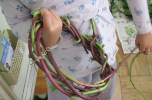 10/23にサツマイモほりをしました。その後に、つるを使ってリースの土台を作りました。巻きつけていくのが難しかった様子ですが、緩まないように気を付けながら、一生懸命巻きつけていくことができました。出来上がりにとても満足している様子でした。