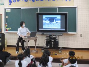 4年生は、総合的な学習の時間に福祉について学んでいます。今回は、福祉施設の方々に学校に来ていただき、福祉施設の様子について写真を見せていただきながら紹介してもらいました。初めて知ることが多く、目を丸くして話を聞いていました。