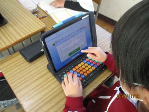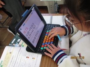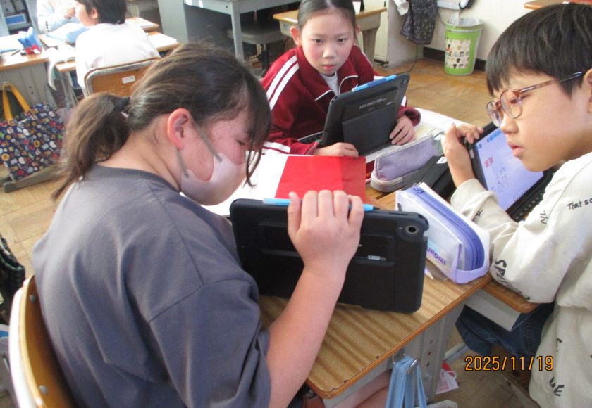 4年生の算数の公開授業がありました。少数のたし算の学習でした。自分たちで課題をつくり、課題に一生懸命取り組む姿がすてきでした。少数のひっ算は、小数点があるだけでミスが多くなります。桁をそろえることや最後に必ず小数点をつけることなどをたくさん問題を解くことでどの子も理解していました。最後はタブレットを使って自分のペースで問題に取り組み、できた分かったを実感していました。