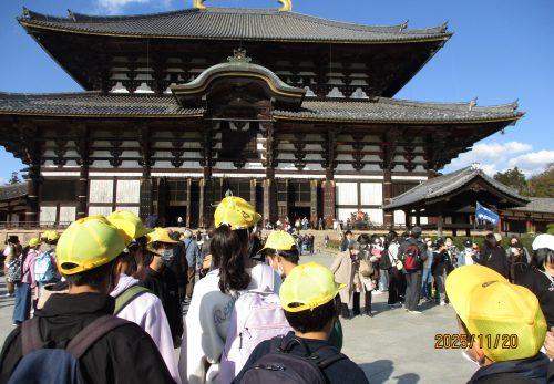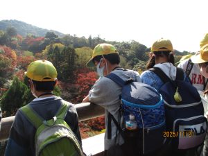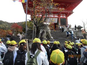 2日目は奈良から京都に朝早く起きて移動しました。まず金閣寺見学です。塗装しなおしたのか前見た時よりも金色が鮮やかでした。紅葉と金閣寺がマッチしてとてもきれいでした。次に二条城です。確かに鴬張りの床は歩くたびにきゅっきゅっと音がしました。襖絵が見事でした。最後に清水寺見学です。ものすごく混んでいました。着物を着た外国の方がたくさんみえました。インバウンドの影響でしょうか。年々京都は人込みが増しているそうです。今年は万博の影響で、中学生と高校生の数が少ないと聞きました。これで少ないの?と思うくらいの人であふれていました。それでも清水の舞台からみた景色はすばらしかったです。