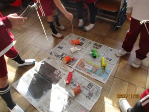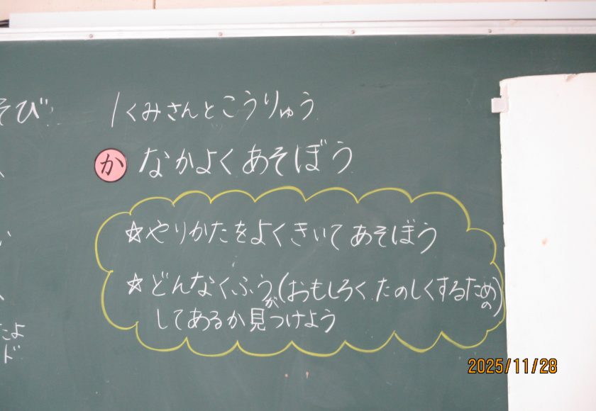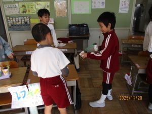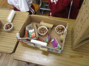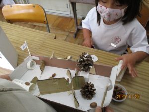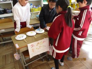 1年生の2クラスが生活科で作ったおもちゃを使って交流会を行いました。昼休みに校庭に落ちていたどんぐりをたくさん拾っていた1年生。そのどんぐりやまつぼっくりといった秋の実を使ったおもちゃでお店を開いて交流していました。どんぐりごま、まつぼっくりのけん玉、どんぐりを使っためいろ、的あて、魚つりなどく楽しいおもちゃがいっぱいでした。ルールは決まっていますが、かなりアバウト。そこが1年生らしく楽しかったです。自分で工夫して想像力を働かせて遊ぶ楽しさをもっともっと味わってほしいなと思います。