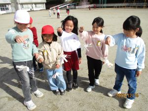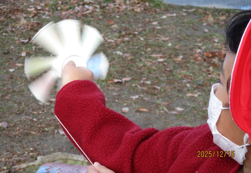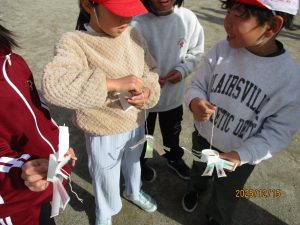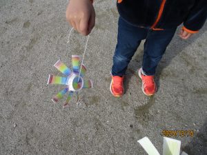 運動場で1年生がたこのようなものをもって走っているなと思い、近づいてみると、それは紙コップで作った風車でした。走ってもうまく回すことはできません。うまく風にのせることが必要です。何度もやりながらうまく回すこつをつかんでいる様子でした。紙コップとたこ糸、とてもシンプルなおもちゃです。クリスマスやお正月に高価なゲームを手にする子もいるでしょう。それが悪いというつもりもありません。けれども家にある単純な材料でおもちゃを手作りし、自分で工夫して遊ぶことも子どもにとって大切な経験のような気がします。