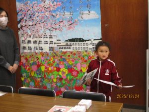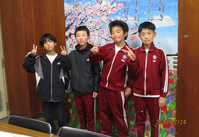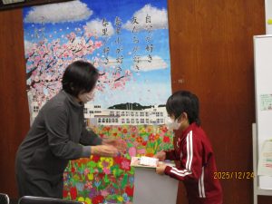 もう1つは可児市教育委員会が主催の「笑顔のもと」奨励賞の表彰です。6年生の4人は、昨年度「あいさつカンパニー」を立ち上げ、朝、東門に立ってあいさつ活動をしています。朝のあいさつを大きな声でした子をお昼の放送で紹介したり、表彰状を送ったりするなど、活動の広げています。春里小の生活をよりよくする自主的な活動であることが受賞した大きな理由です。