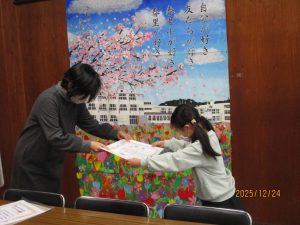 1つは夏休みの作品として出品したJA主催の書道コンクールで入賞した3人の表彰です。
