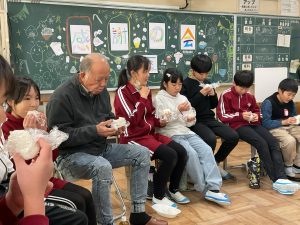 第1部では、今年収穫した春里米を使った塩むすびを各クラスで味わいました。お米のおいしさを感じながら、笑顔あふれるひとときとなりました。