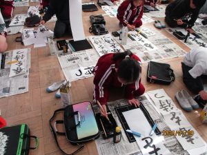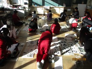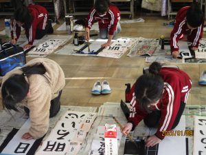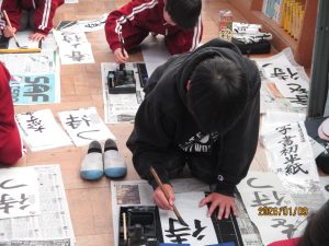3年生と4年生が書初め会を行いました。3年生は初めての毛筆の書初めです。1文字1文字丁寧に書いていました。条幅の用紙は縦長なので、バランスよく文字を書くことは思っている以上に難しいです。昨日の5,6年生に比べるとバランスよく書くことがいかに難しいことかが分かります。お手本の字をよく見て書いているつもりでも、字を間違えてしまったり、用紙の下の方があいてしまったりと苦戦している姿が多々見られました。それでも書き上げた時にはどの子もとても満足そうでした。