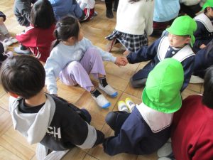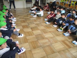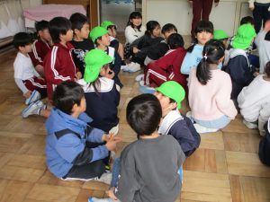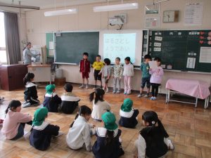 1年生のみんなも年長さんが来てくれたので、とてもはりきっていました。司会も堂々としていました。グループを作るゲームやじゃんけん列車という2つのゲームを一緒に行いました。さりげなく年長さんに声をかけている姿を見て、小学生としての1年間の成長を感じました。