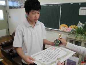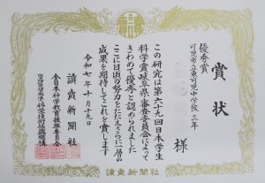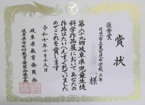 夏休みに頑張った理科の研究で、見事、岐阜県の優秀賞を受賞しました。かびの研究を行ったそうで、本人も理系教科は得意だそうです。将来は、自分の好きな理系の仕事に就きたいと考えています。こんな素晴らしい能力を是非とも伸ばしてほしいと願っています。おめでとうございます。