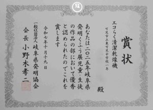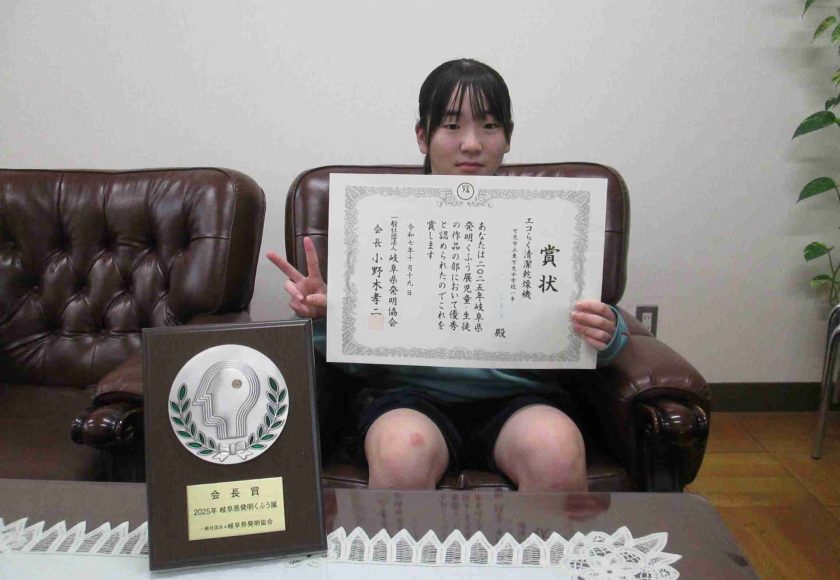 前回紹介した生徒が、今年度新たに発明しました。今年の夏休みに「エコらく清潔乾燥機」を作成しました。これは、缶ジュースやペットボトルなどを自動で分別する装置です。2025年岐阜県発明くふう展において、見事「会長賞」となりました。まるで発明の天才であったエジソンのようですね。「今、何が欲しいの?」と聞くと、「スマホ!」と庶民的な答えに、益々高感度もあがりました。これからの活躍が楽しみですね。おめでとうございます。