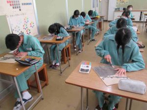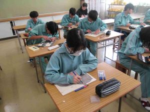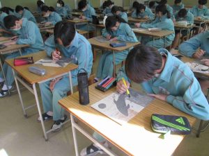 美術の授業です。3年生の版画ですが、かなり進んできました。細かな作業ですが、根気強く掘り進めています。本当に素晴らしい作品だらけです。