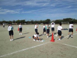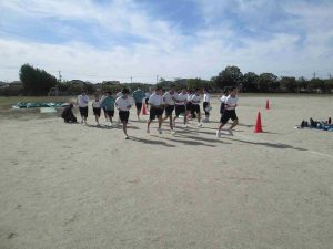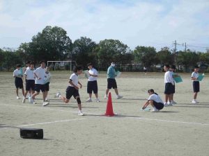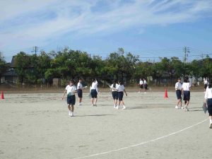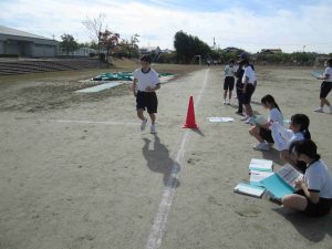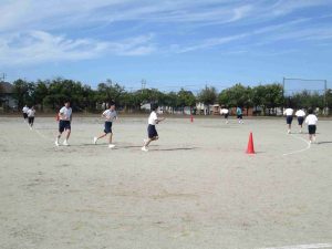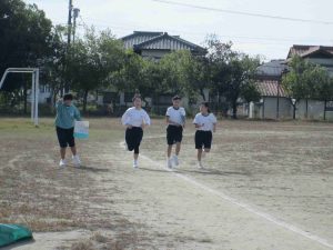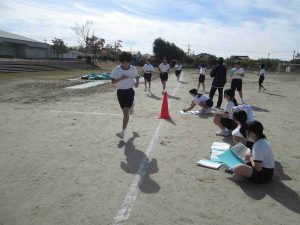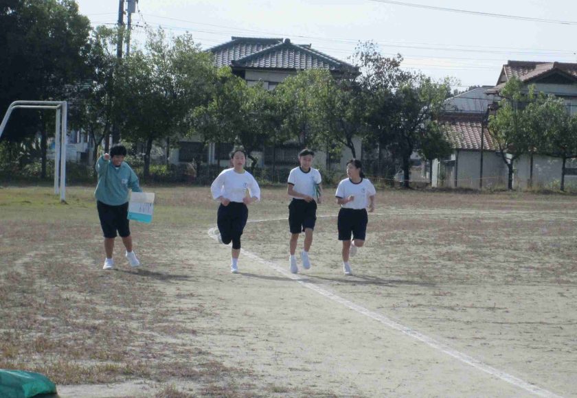 さて、1年生の体育の授業で、持久走を行っています。男子は2000m、女子は1500m走ります。小学校では長くても1000mなので、きっと苦手な生徒にとっては大変ですね。しかし、「頑張れ!」という声援をもらいながら、最後まで頑張りました。