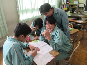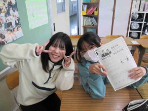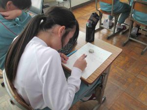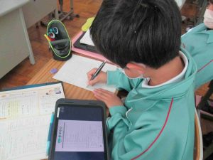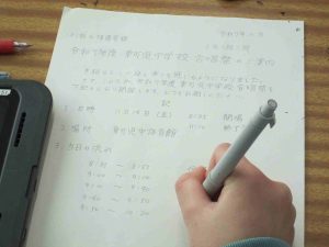 今日の朝は5℃で冷え込んでいました。しかし、日向に入ると温かく、太陽の有難さを感じます。1年生の国語の授業で、親さん向けに合唱祭の案内文書をつくっていました。案内を出すのが親さんなので、改めて文章にすることに四苦八苦していました。いつもは、お便りとしていただいていた文書でしたが、作成する側になると色々と考えることも多いのでしょう。