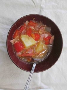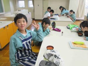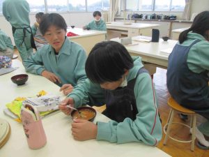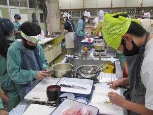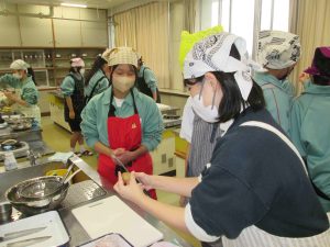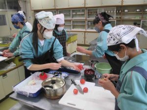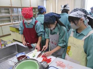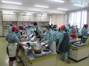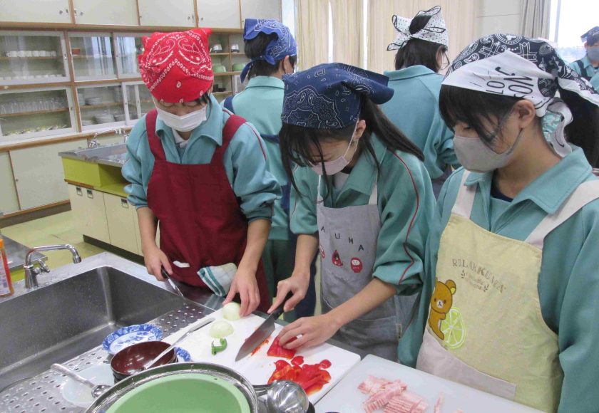 さて、1年生の家庭科の授業で調理実習を行っていました。今日のメニューは「ミネストローネ」です。野菜を切り、そして煮詰めます。美味しく作れたみたいでした。
