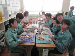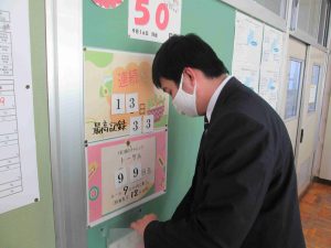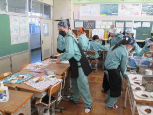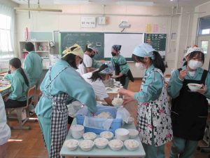 さて、今日は1年2組の給食配膳に潜入です。このクラスでは、4月から給食の配膳をクラスの仲間で協力しながら頑張っていました。目標タイムを99回も達成するなんて、すごいクラスの力ですね。