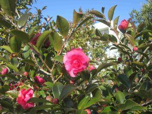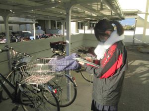 今日は穏やかな天気でした。校門付近の椿が咲いていました。赤い花が映えています。8時15分ごろ、自転車のカギがかけられているのか点検する生徒がいました。お疲れ様です。カギの閉め忘れには注意です。