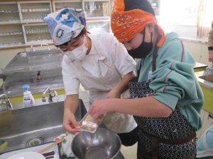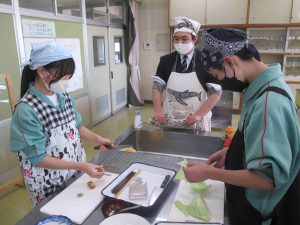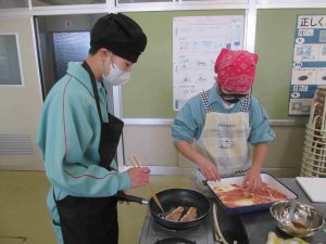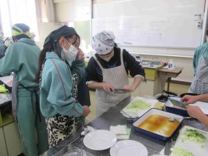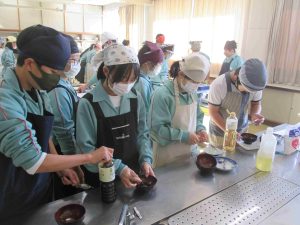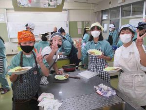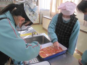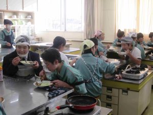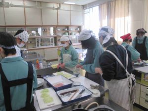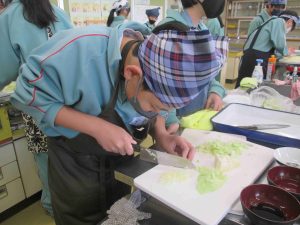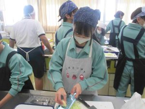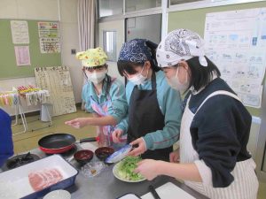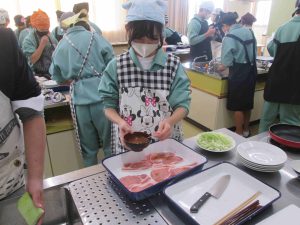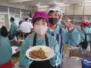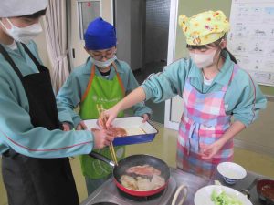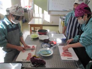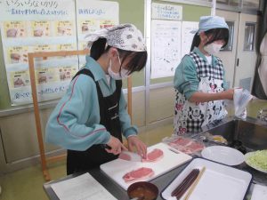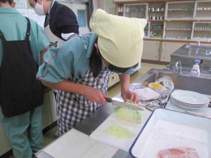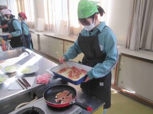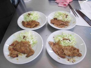 さて、1年生の家庭科の時間に、「豚肉の生姜焼き」をつくりました。キャベツの千切り、生生姜をすり、そしてたれをつくり、さらに豚肉の筋切りを行い、そして生姜焼きにしました。2年生の生徒が生姜のよい香りに誘われて、調理室を覗いていました。とても美味しくできました。