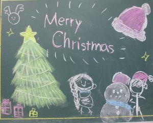 今日はクリスマスイブです。クラスの予定黒板には、クリスマスの絵が描かれていました。