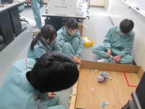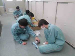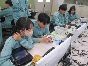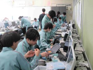 生徒の様子です。3年生ともなるとプログラミングも複雑になってきます。色々と試行錯誤でした。