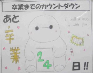 今日の昼頃、雪が舞っていました。まだ寒い日が続きます。ふと、3年生の教室をのぞくと、「卒業カレンダー」がありました。卒業式まであと24日、授業日として25日でした。
