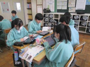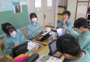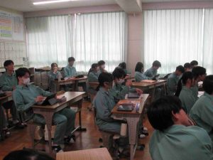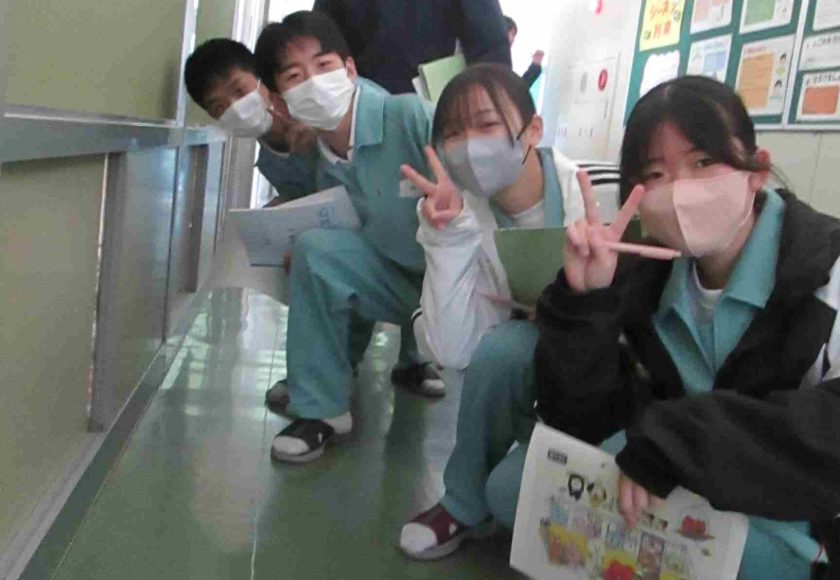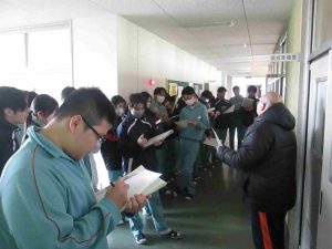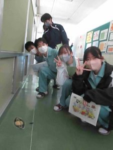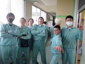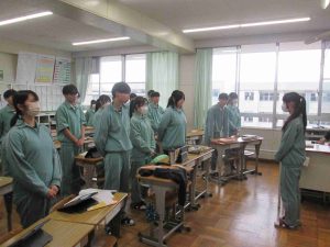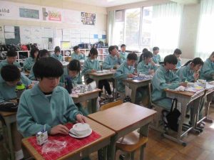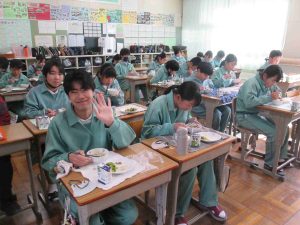 生徒の様子です。インフルエンザ予防のため、前向き給食にしました。