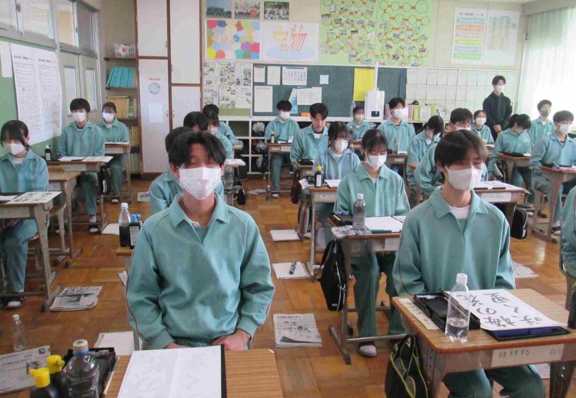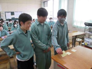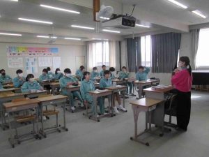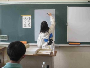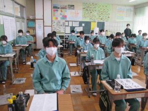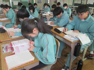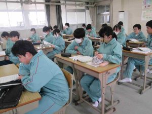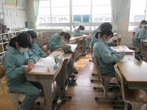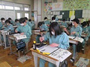 生徒の様子です。1,2年生は木曜日から期末テストなので、ワークなどの学習をする時間が多かったです。書道の時間は書く前に黙想をします。心を落ち着かせてから全集中で書きました。