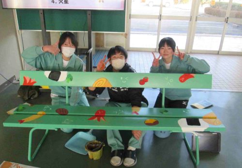 先生がベンチにスプレーで着色していました。何になるのか楽しみです。