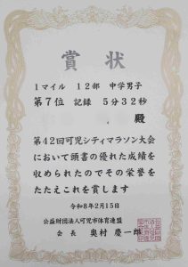 先日行われた「可児シティマラソン大会」に参加し、見事した生徒が報告に来ました。日頃、部活動で鍛えた健脚を、見事発揮しました。まさに「疾走」の走りでした。おめでとうございます。