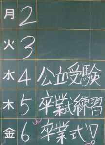 3年生にとって、いよいよ今週が最後です。今週の予定黒板を見ると、本当に残りわずかなのだと実感します。
