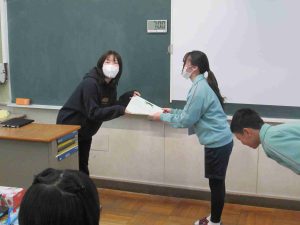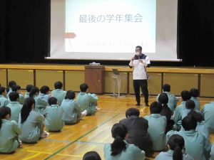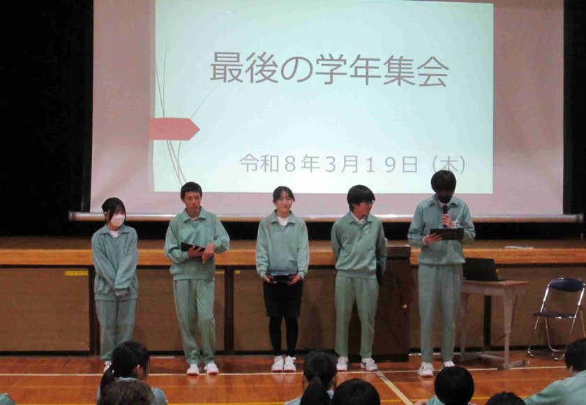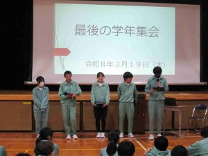 いよいよ今年度も残り4日となりました。最後の学年集会、最後の授業と「最後」という2文字が現実的です。教科担任に一年間お世話になったということで、寄せ書きを作成するなど、感謝の気持ちを表す素敵な場面が多かったです。