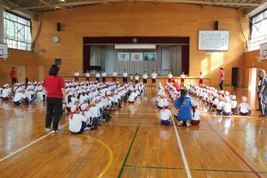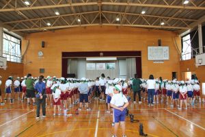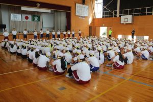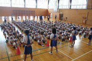 運動会に向けて、各団の団結式がありました。応援リーダーが運動会への思いを話しながら、みんなで「ゴーゴーゴー」を歌いました。運動会に向けての気持ちが高まりました。