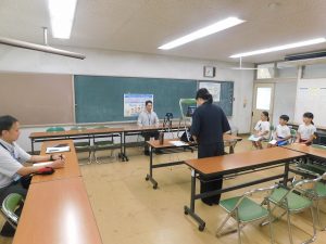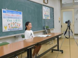 配信会場は会議室。時間前に、児童代表の3名がリハーサルをしていました。